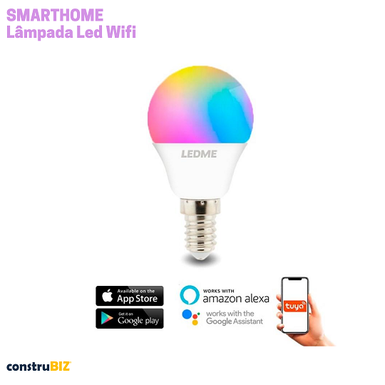 A lâmpada SMART Wifi G45 de 6W para casquilho E14, tem função de seleção de cor RGB + CCT, controlável por aplicação móvel via ligação WIFI ou através do Google Home e Amazon Alexa.